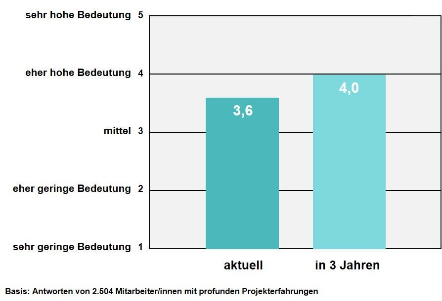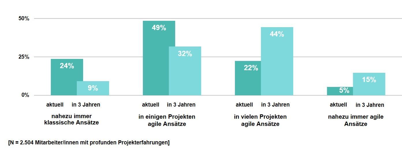 Schon heute werden in nur 24% der Unternehmen Projekte ohne agile Ansätze durchgeführt. In drei Jahren wird dieser Anteil, in denen Projekte mit traditionellen und klassischen Ansätzen des Projektmanagements durchführt werden, nur noch 9% betrage – während dann in 59% der Unternehmen agile Ansätze in vielen oder allen Projekten genutzt werden. Daher ist aus den Antworten der Befragten eindeutig zu konstatieren, dass agile Ansätze im Projektmanagement immer mehr gefragt sind.