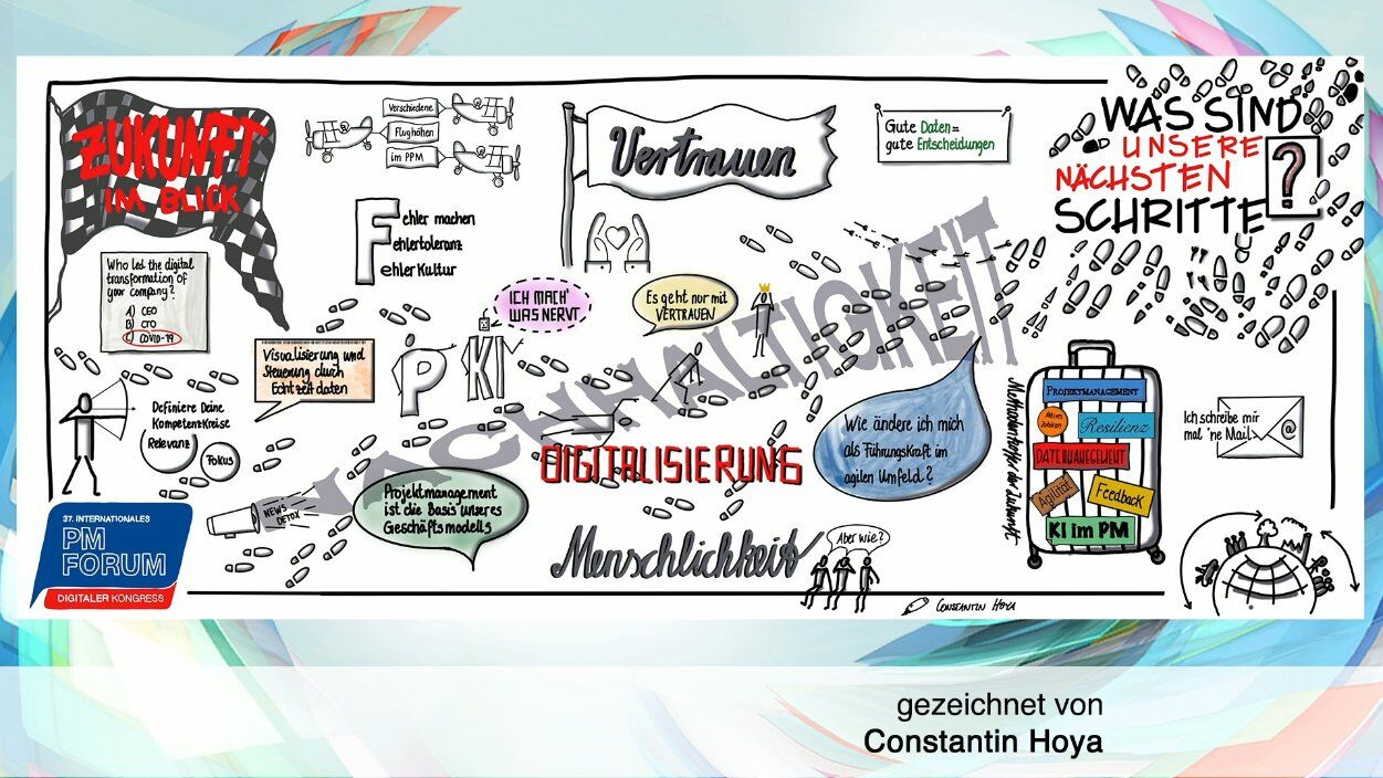 Zurückgekehrt aus den abschließenden Workshops des Tages nahm Ralf Schmitt noch einmal alle Teilnehmenden im digitalen Plenum in Empfang, warf mit ihnen einen Blick auf die Highlights des Tages und gab die beeindruckende Teilnehmerzahl bekannt: rund 1.400 angemeldete Zuschauerinnen und Zuschauer an den drei Tagen. Zum Abschluss gab es dann, wie an jedem der drei Tage, eine visuelle Zusammenfassung des Tages, gezeichnet von GPM Fachgruppenleiter Constantin Hoya.