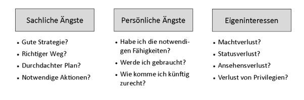 Die drei Angsttypen sind der Motor für Widerstände, werden jedoch häufig hinter Sachargumenten versteckt und deshalb verkannt. Das Problem ist nur: Ängste kann man nicht einfach mit Sachargumenten „wegreden“.