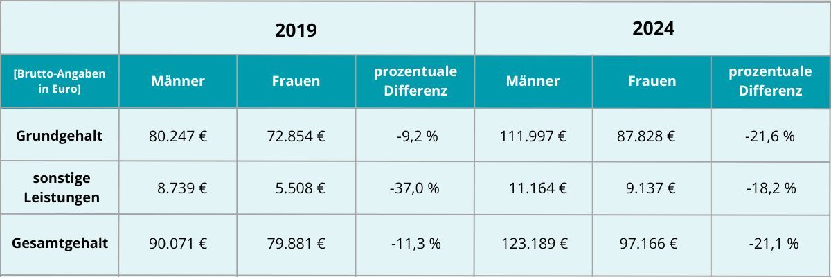 Auch beim Gesamtgehalt, also inklusive Boni und Zusatzleistungen, zeigt sich ein ähnliches Bild. Hier betrug die Differenz 2019 noch 11,3 % und liegt 2024 bereits bei 21,1 %.