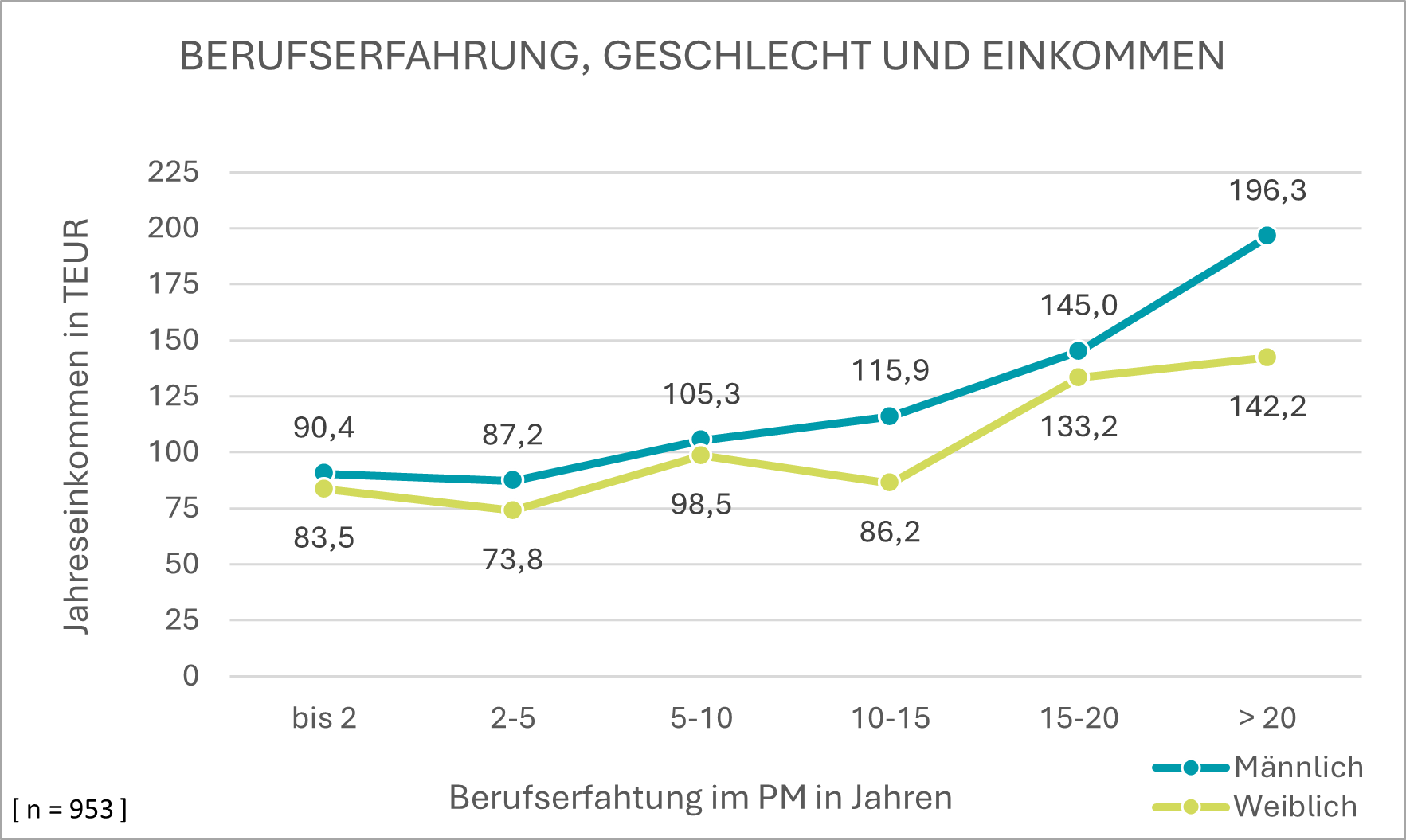 Ein differenzierteres Bild ergibt sich, wenn man den Faktor Berufserfahrung betrachtet. Der direkte Vergleich der Daten aus den Jahren 2019 und 2024 zeigt eindrucksvoll, wie sich Einkommen im Projektmanagement mit wachsender Erfahrung entwickelt – und wie sich dabei die Unterschiede zwischen Männern und Frauen verändern.