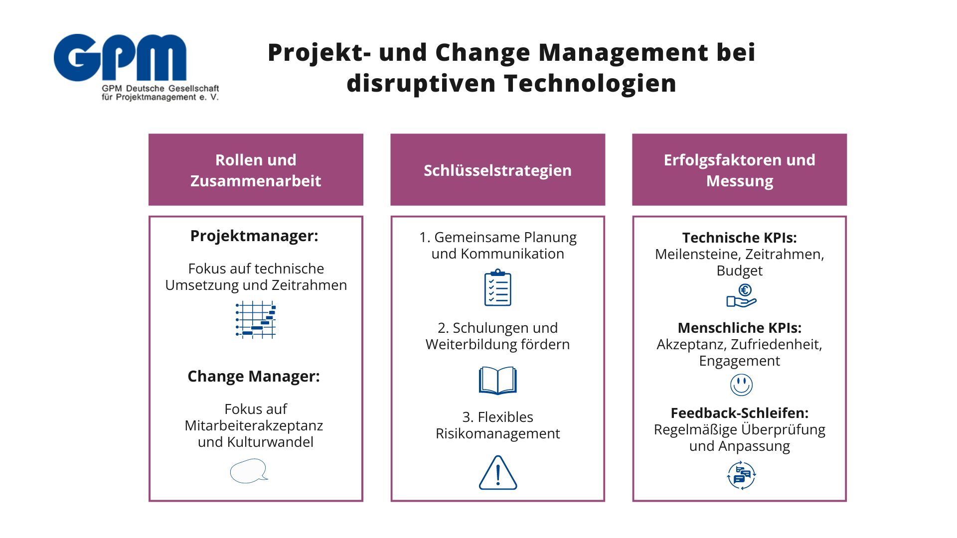 Die erfolgreiche Anpassung an disruptive Technologien erfordert sowohl ein effektives Projektmanagement für die technische Umsetzung als auch ein starkes Change Management für die menschliche Seite der Veränderung. Projektmanager und Change Manager spielen dabei komplementäre Rollen und sollten eng zusammenarbeiten, um sicherzustellen, dass sowohl die technischen als auch die kulturellen Herausforderungen erfolgreich gemeistert werden.