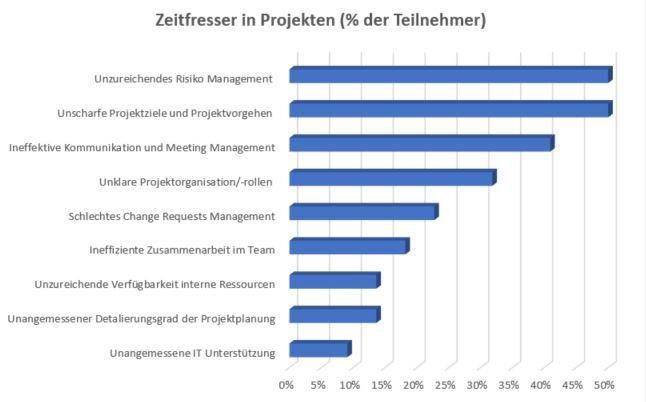 In einer Umfrage haben wir erfahrene Projektleiter und Auftraggeber nach ihren Top-Drei der größten Zeitfresser in Projekten gefragt. Die Ergebnisse sind in der Übersicht in Abbildung 1 zusammengefasst.